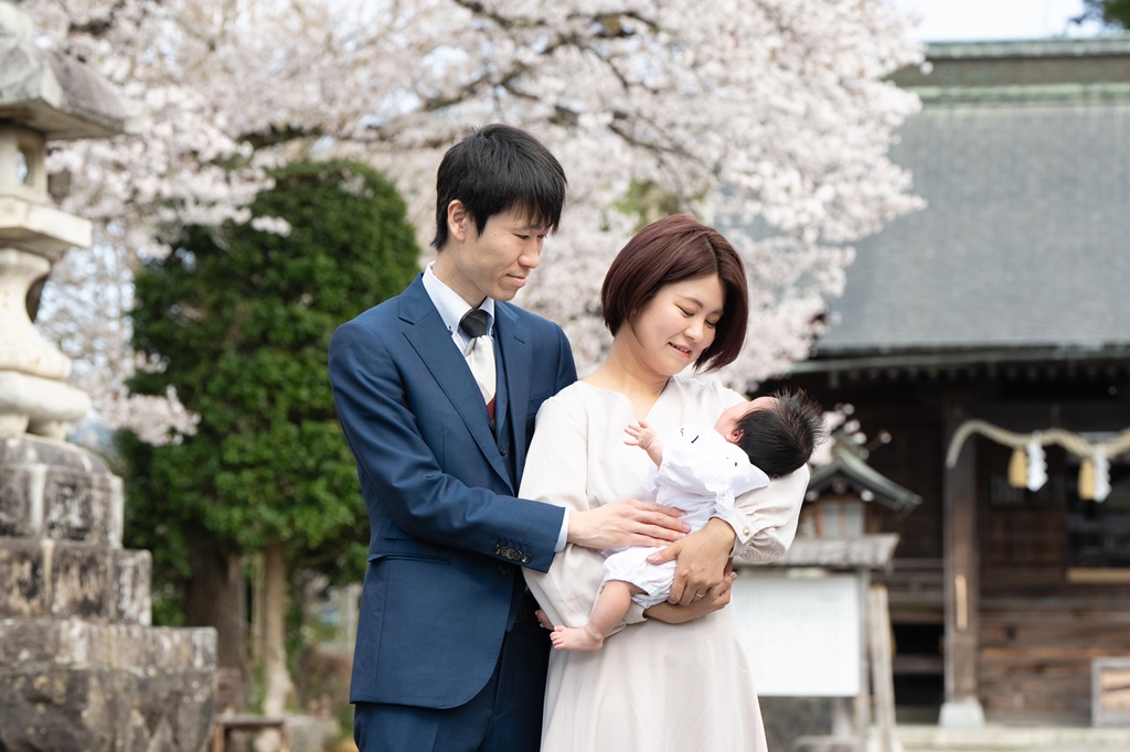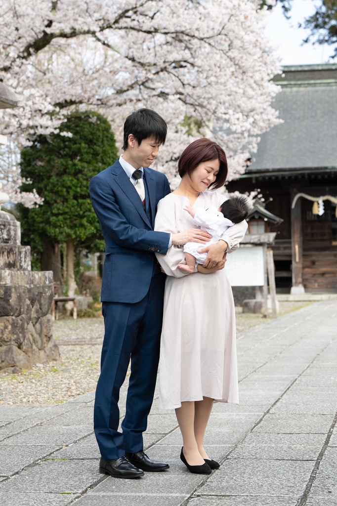 桜背景で赤ちゃんとの3ショット!